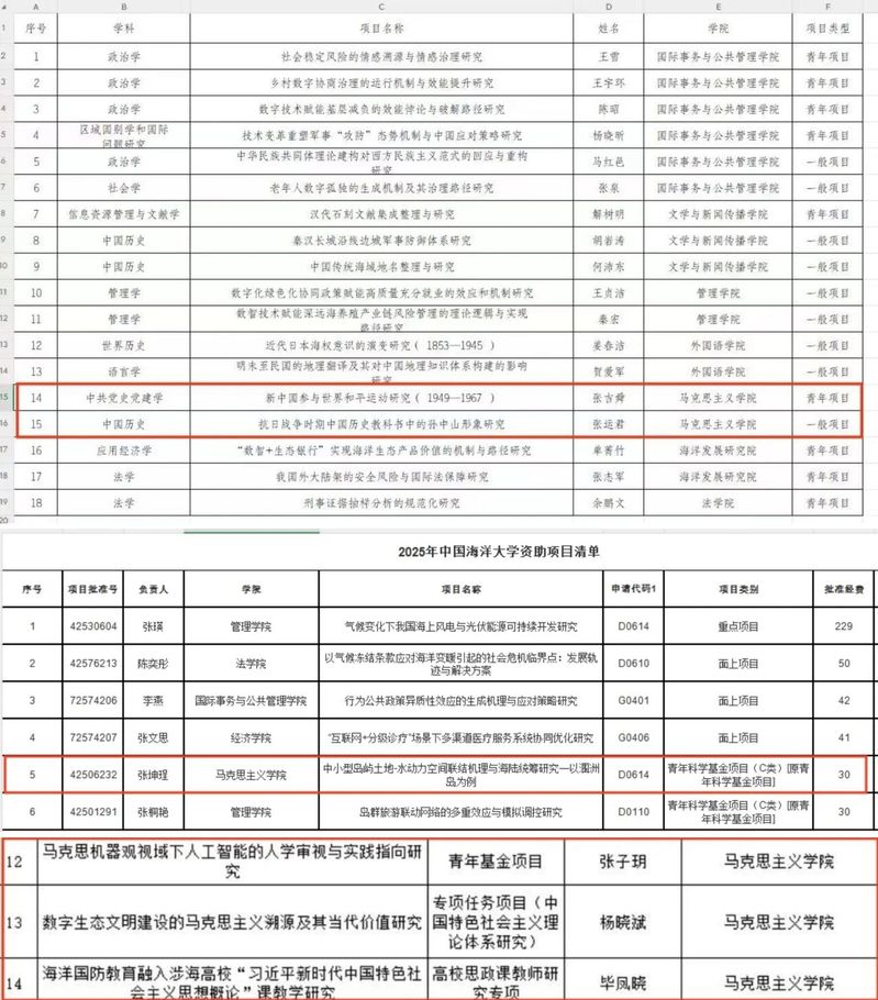其中,张运君教授申报的“抗日战争时期中国历史教科书中的孙中山形象研究”获批国家社科基金一般项目;张吉舜老师申报的“新中国参与世界和平运动研究(1949-1967)”获批国家社科基金青年项目;张坤珵副教授申报的“中小型岛屿土地-水动力空间联结机理与海陆统筹研究——以涠洲岛为例”获批国家自科基金青年项目;杨晓斌教授申报的“数字生态文明建设的马克思主义溯源及其当代价值研究”获批教育部人文社科研究专项任务项目(中国特色社会主义理论体系研究);张子玥老师申报的“马克思机器观视阈下人工智能的人学审视与实践指向研究”获批教育部人文社科研究青年项目;毕凤晓申报的“海洋国防教育融入涉海高校‘习近平新时代中国特色社会主义思想概论’课教学研究”获批教育部高校思政课教师研究专项青年项目。