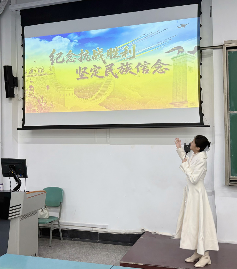 马克思主义学院教师连雪晴围绕“纪念抗战胜利、坚定民族信念”开展专题教学活动。连雪晴指出,在纪念中国人民抗日战争暨世界反法西斯战争胜利80周年、庆祝中华人民共和国成立76周年的重要时刻,更要深化爱国主义教育。她勉励青年学生赓续爱国情怀,勇立时代潮头,在百年变局中挺膺担当,为国家和人民贡献青春力量。