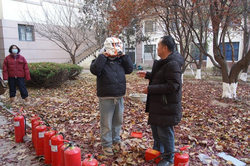 在消防器材实操教学环节,张式栋结合实物展示,细致讲解了常用消防器材的性能特点与使用技巧,现场演示了干粉灭火器“提、拔、握、压”的操作步骤,并对消防水带的连接和使用方法进行了展示。此外,张式栋还为师生讲解了防烟面罩的佩戴规范、烟雾报警器的工作原理及安全通道指示牌的布设要求等内容。在保卫处老师们的专业指导下,师生代表依次进行水带连接、防烟面罩佩戴、灭火器使用等实操训练。