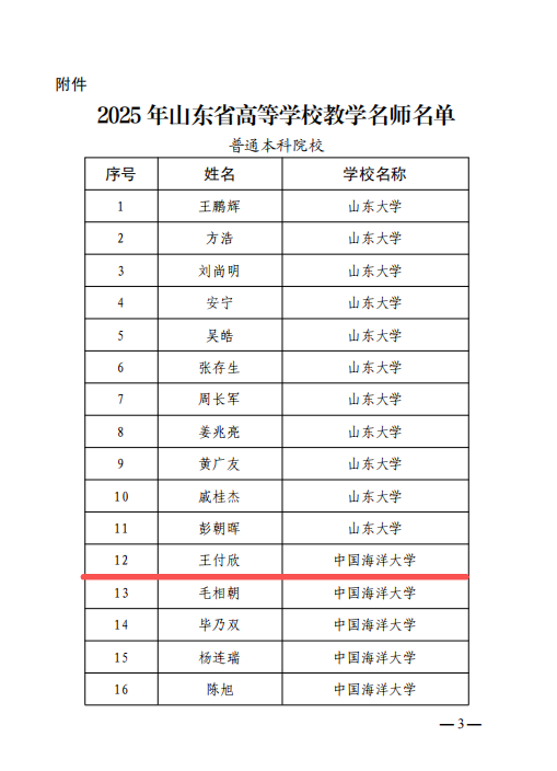 近日,山东省教育厅公布了2025年山东省高等学校教学名师入选名单,学院王付欣教授获评“2025年山东省高等学校教学名师”。