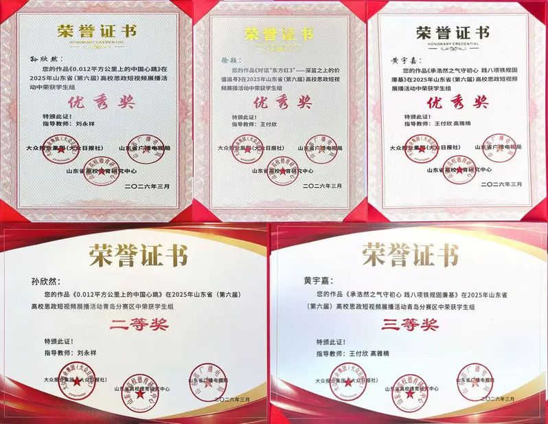 本次活动中,青年马克思主义者宣讲团成员孙欣然、黄宇嘉、徐颖三位同学凭借优质作品,荣获2025年山东省(第六届)高校思政短视频展播活动优秀奖3项,同时获评青岛分赛区二等奖1项、三等奖1项,展现出马院学子扎实的理论素养与突出的宣讲能力。