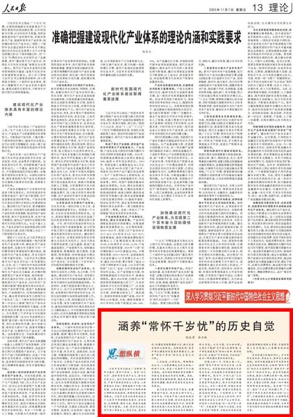11月7日,《人民日报》理论版刊发学院名师工程讲席教授张运君和研究生张亦弛撰写的文章《涵养“常怀千岁忧”的历史自觉》,该文已被人民网、光明网、求是网、中国共产党新闻网、新浪网、搜狐网等网站转载。文章全文如下:习近平总书记指出:“正所谓‘生年不满百,常怀千岁忧’。坚定‘四个自信’,最终要坚信共产主义、坚信马克思主义。我们身处社会主义初级阶段、干着中国特色社会主义事业,心要想着远大目标。”前进道路不可能一帆风顺,必然会遇到各种可以预料和难以预料的风险挑战、艰难险阻甚至惊涛骇浪。习近平总书记的重要论述为广大党员干部增强忧患意识,居安思危、未雨绸缪,胸怀大局、着眼长远提供了根本遵循。当前,有的同志在工作中陷入事务主义、得过且过、急功近利,对潜在风险警惕性不足,缺乏长远目标和大局观念。这深刻表明,党员干部以强烈的忧患意识警醒自己,涵养“常怀千岁忧”的历史自觉尤为必要。人无远虑,必有近忧。唯物辩证法认为,一切事物都包含对立和统一的两个方面,并在一定条件下可以相互转化。在对现存事物的肯定理解中同时包含着相应的否定理解。因此,越是取得成绩的时候,越是要有如履薄冰的谨慎,越是要有居安思危的忧患意识。我们
